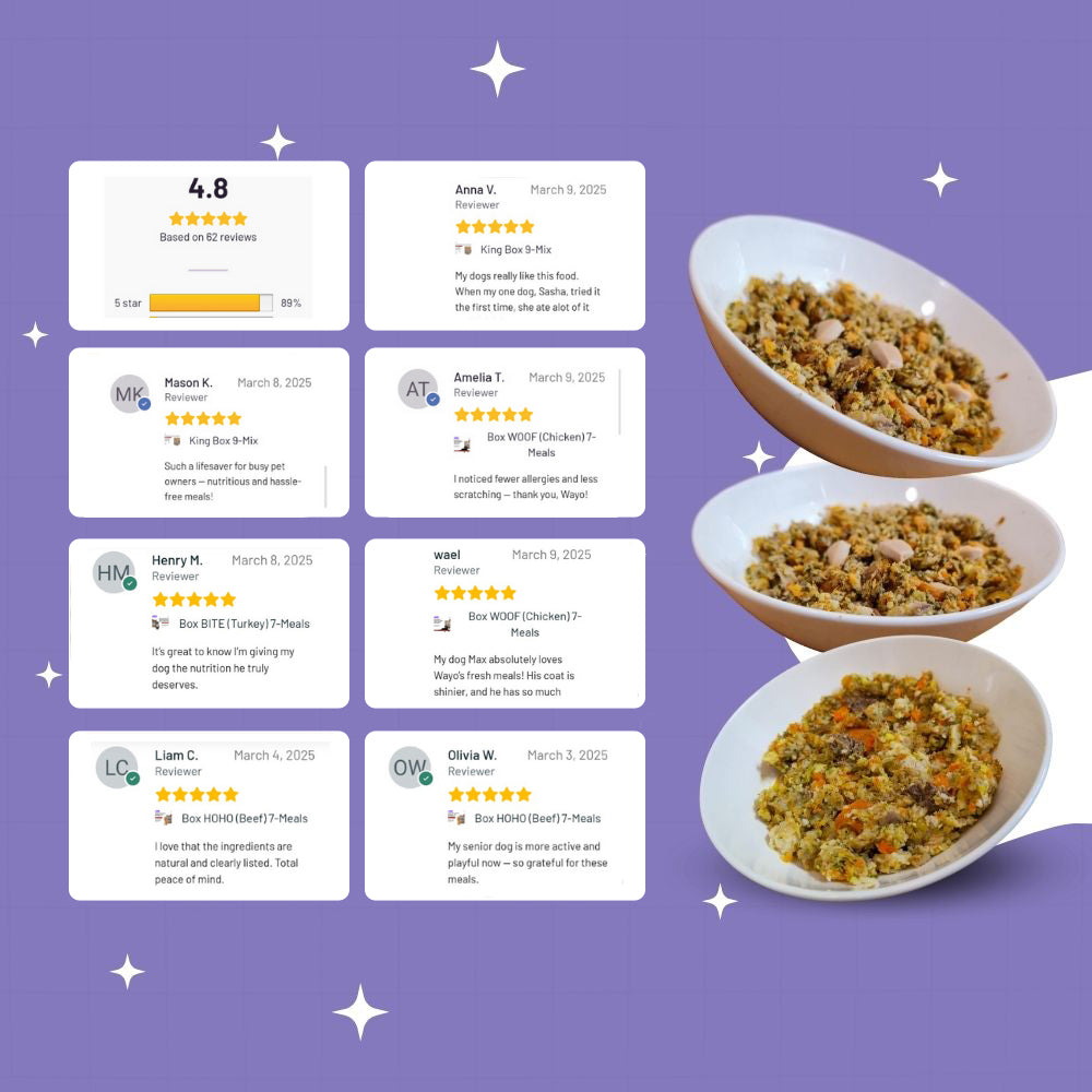 Fresh delivery to your doorstep, Custom meal plans based on your pet’s weight and activity, Flexible monthly subscriptions Daily feeding calculations based on age and size, Full support from the WAYO nutrition team
